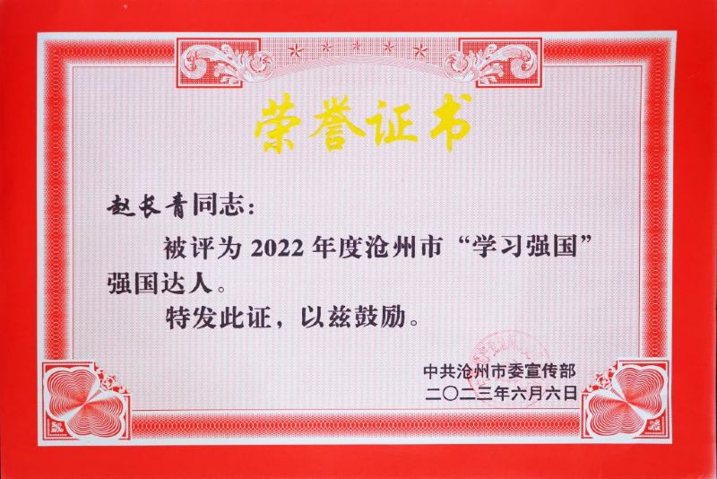 在“學(xué)習(xí)強(qiáng)國”滄州學(xué)習(xí)平臺(tái)上線兩周年之際,滄州市委宣傳部下發(fā)了關(guān)于評(píng)選全市“強(qiáng)國達(dá)人”的通知,在全市范圍內(nèi),以總學(xué)習(xí)積分為標(biāo)準(zhǔn)評(píng)選“強(qiáng)國達(dá)人”。截至5月20日,我公司共有30多名職工學(xué)習(xí)總積分和年度學(xué)習(xí)積分達(dá)到初評(píng)條件。最終,趙長(zhǎng)青憑借總積分優(yōu)勢(shì)被評(píng)選為滄州市“強(qiáng)國達(dá)人”。