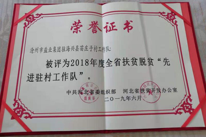 近日,滄州鹽業(yè)集團(tuán)駐苗莊子村工作隊(duì),被中共河北省委組織部、河北省扶貧開發(fā)辦公室授予2018年度全省扶貧脫貧“先進(jìn)駐村工作隊(duì)”稱號(hào)。