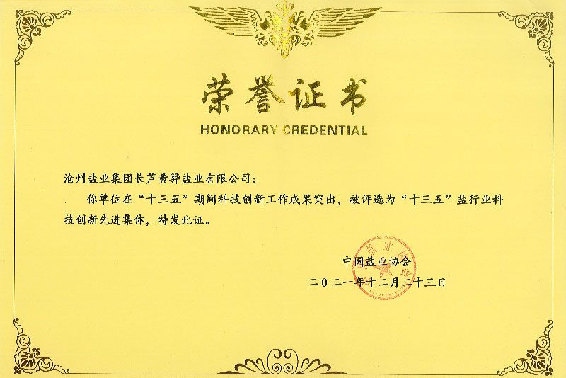 近日,從中國鹽業(yè)協(xié)會傳來喜報(bào),長蘆黃驊鹽業(yè)有限公司被中國鹽業(yè)協(xié)會評為2021年度“十三五鹽行業(yè)科技創(chuàng)新先進(jìn)集體”,經(jīng)理宋建林被評為“十三五鹽行業(yè)科技創(chuàng)新先進(jìn)個(gè)人”。