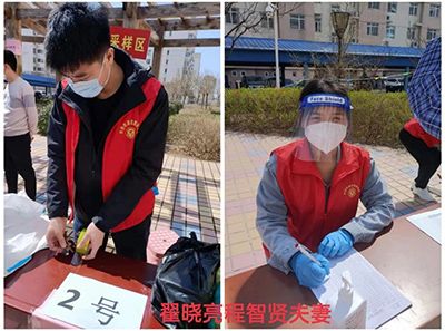 居家辦公的共產(chǎn)黨員陳玲、李國剛夫婦,主動申請加入鹽場新區(qū)志愿服務隊,兩人相互鼓勵,并肩作戰(zhàn),積極配合醫(yī)務人員、社區(qū)工作人員做好信息核實登記、現(xiàn)場布置、發(fā)動喊人、維持秩序、場地消毒、深夜照明等項工作,并主動提供桌椅板凳以供檢測使用。