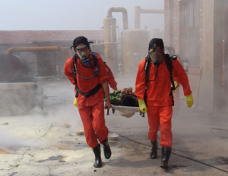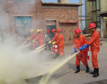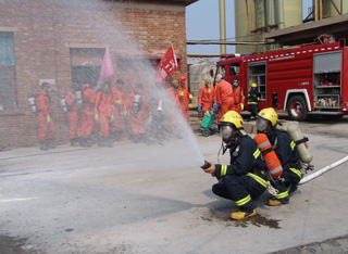 在模擬火災(zāi)現(xiàn)場(chǎng),救援車(chē)輛滿(mǎn)載救援隊(duì)員及搶救器材、物資在第一時(shí)間進(jìn)入現(xiàn)場(chǎng),救援人員使用干粉滅火器,對(duì)準(zhǔn)火源,迅速將火撲滅。與此同時(shí),在模擬液氯鋼瓶泄漏救援演練現(xiàn)場(chǎng),液氯鋼瓶發(fā)生泄漏,救援人員一面組織現(xiàn)場(chǎng)人員用濕毛巾捂住口,向上風(fēng)口方向緊急疏散;一面佩戴專(zhuān)業(yè)空氣呼吸器,身著防化服,用液氯捕消器對(duì)泄漏源實(shí)施氯氣捕消和封堵,并將封堵后的鋼瓶由叉車(chē)送到液堿池進(jìn)行中和處理。在救援過(guò)程中,現(xiàn)場(chǎng)有一人氯氣中毒,現(xiàn)場(chǎng)總指揮立即派出4名救援隊(duì)員用擔(dān)架將傷員移至安全地帶,并同時(shí)向醫(yī)療急救中心和消防大隊(duì)請(qǐng)求救援。隨后,救護(hù)車(chē)、消防車(chē)先后趕到,醫(yī)護(hù)人員迅速對(duì)受傷人員實(shí)施搶救,消防人員則馬上啟動(dòng)消防設(shè)施,進(jìn)行水霧空中噴灑,將空氣中的氯氣吸附,控制事故范圍。事故處理完畢后,經(jīng)現(xiàn)場(chǎng)毒氣檢測(cè),空氣中氯氣含量降至安全水平。至此,2010年中鹽長(zhǎng)蘆滄州鹽化集團(tuán)有限公司危險(xiǎn)化學(xué)品及消防應(yīng)急救援演練順利結(jié)束。
