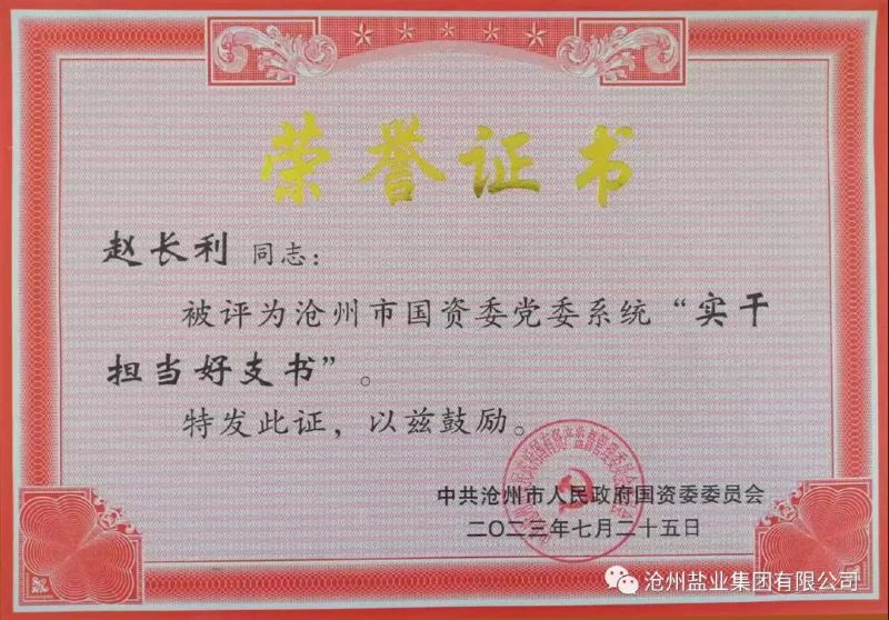 趙長利現任滄州鹽業(yè)集團長蘆黃驊鹽業(yè)集團有限公司黨總支書記,他以求真務實的態(tài)度,清正廉明的作風,為民服務的熱情,認真履行職責,圓滿完成公司黨委及上級部門交給的各項任務。自2019年至今,長蘆公司黨總支先后4次被集團公司黨委授予“先進黨總支”“黨建引領先進黨總支”榮譽稱號,趙長利本人還多次被授予“優(yōu)秀共產黨員”“特殊貢獻先進個人”“產業(yè)升級標兵”等榮譽稱號。