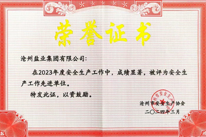2023年,實現(xiàn)全年安全生產(chǎn)無重傷、無責(zé)任死亡事故,輕傷事故率在3‰以內(nèi),為推動滄鹽高質(zhì)量發(fā)展發(fā)揮了積極作用。