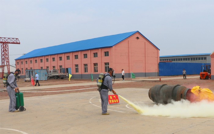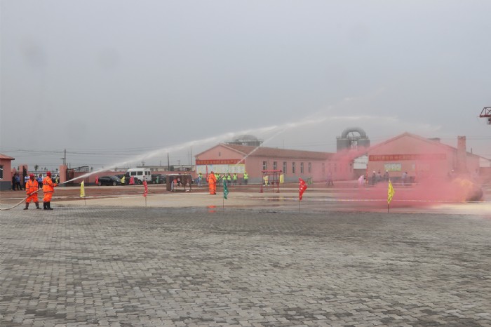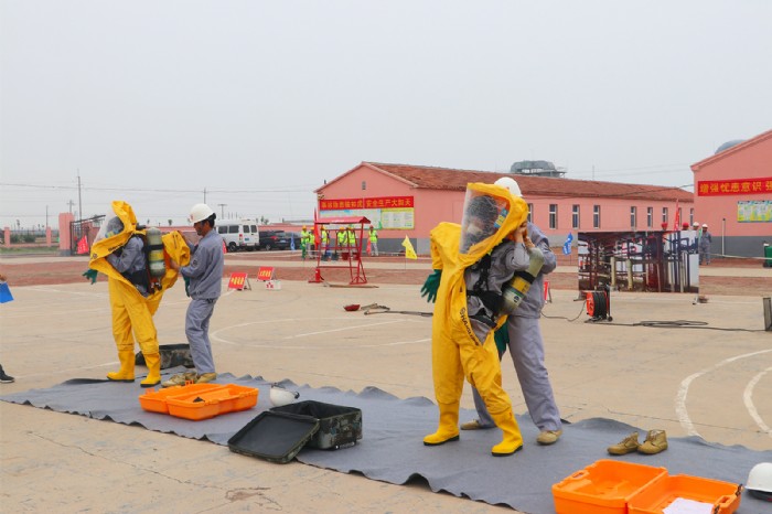 此次演練模擬了機(jī)械傷害、中暑、觸電、火災(zāi)、溴素燙傷、氯氣泄漏六個(gè)事故場(chǎng)景。演練開始前,進(jìn)行了空呼機(jī)穿戴、全封閉防化服穿戴、空呼機(jī)穿戴30米跑、消防等技能比武活動(dòng)。