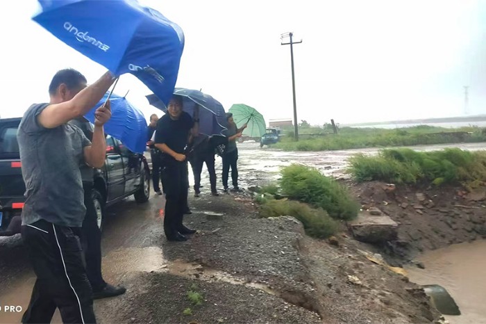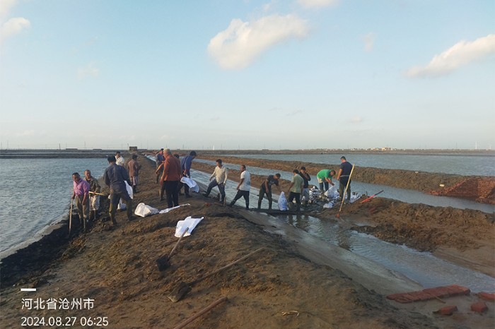 8月26日中午12點(diǎn)至下午5點(diǎn),疾風(fēng)驟雨襲擊廠區(qū),最大風(fēng)力持續(xù)達(dá)11級(jí),幾個(gè)小時(shí)內(nèi)降雨量達(dá)150毫米以上,灘田內(nèi)波浪翻滾,猛烈沖擊著堤埝。渤海新區(qū)黃驊市氣象災(zāi)害防御指揮部將重大氣象災(zāi)害由二級(jí)應(yīng)急響應(yīng)提升為一級(jí)。集團(tuán)公司黨委副書記、總經(jīng)理張立莊率隊(duì)親臨生產(chǎn)一線督導(dǎo)防汛工作。