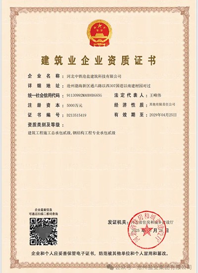 5月26日,河北中鐵滄鹽建筑科技有限公司成功實(shí)現(xiàn)了資質(zhì)證書(shū)的升級(jí),資質(zhì)類別及等級(jí)正式提升為建筑工程施工總承包貳級(jí)、鋼結(jié)構(gòu)工程專業(yè)承包貳級(jí)。