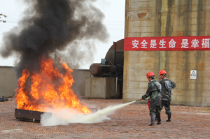 在模擬火災(zāi)現(xiàn)場,現(xiàn)場人員發(fā)現(xiàn)火情及時報告,演練指揮中心立即向救援突擊隊下達救援滅火命令。救援突擊隊第一時間進入現(xiàn)場,救援人員使用干粉滅火器對準火源實施滅火。由于火勢太大,演練指揮中心下達啟動消防設(shè)施的命令。救援突擊隊立即開啟消防水泵,迅速將火撲滅。