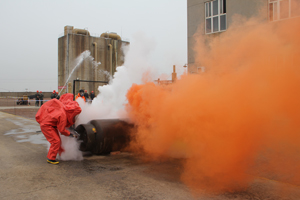 與此同時,在模擬液氯鋼瓶泄漏救援演練現(xiàn)場,液氯鋼瓶發(fā)生泄漏,工作人員立即拉響警報器,救援人員一面組織現(xiàn)場人員用濕毛巾捂住口鼻,向上風口方向緊急疏散;一面佩戴專業(yè)空氣呼吸器,身著防化服,破開車間門、窗,用液氯捕消器對泄漏源實施捕消和封堵。救援人員發(fā)現(xiàn)現(xiàn)場有一人氯氣中毒后,立即報告給演練指揮中心,指揮中心立即派出2名救援隊員用擔架將傷者移至安全地帶,并組織醫(yī)護人員迅速對傷者實施搶救。消防人員則馬上啟動消防設(shè)施,進行水霧空中噴灑,中和、吸附泄漏到空氣中的氯氣,降低危害程度,控制事故范圍。事故處理完畢后,經(jīng)現(xiàn)場毒氣檢測,空氣中氯氣含量降至安全水平。至此,中鹽長蘆滄州鹽化集團有限公司2013年應(yīng)急救援實戰(zhàn)大演練到此結(jié)束。