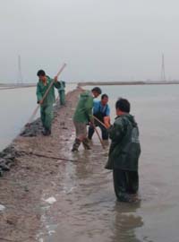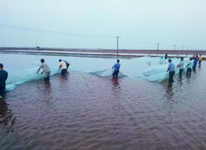 面對(duì)形勢(shì)異常嚴(yán)峻的雨情,公司保原鹽、保塑苫、保灘田的搶險(xiǎn)戰(zhàn)役打響了,從7月17日的141.2毫米暴雨開(kāi)始,防汛副總指揮李蜻海就防汛工作進(jìn)行了安排:生產(chǎn)部負(fù)責(zé)好全公司防汛工作的統(tǒng)一調(diào)度工作,制鹵場(chǎng)要想盡一切辦法確保主排淡系統(tǒng)的疏通,并要求各制鹽場(chǎng)的防汛指揮機(jī)構(gòu)組織全部啟動(dòng),全體一線干部職工都要隨時(shí)待命,嚴(yán)陣以待,嚴(yán)防死守,做好搶險(xiǎn)自救工作。與此同時(shí),防汛副總指揮李蜻海帶領(lǐng)生產(chǎn)部、制鹵場(chǎng)有關(guān)人員對(duì)主排淡系統(tǒng)進(jìn)行了詳細(xì)巡查,并積極協(xié)調(diào)相關(guān)部門(mén)對(duì)影響排淡的17處堵卡地段進(jìn)行了徹底的加寬疏通清理。隨著7月21日60.2毫米降水的到來(lái), 29日、30日,8月2日、3日連續(xù)四場(chǎng)計(jì)270毫米的強(qiáng)降水席卷了整個(gè)生產(chǎn)場(chǎng)區(qū),生產(chǎn)基礎(chǔ)遭受到空前的劫難,隨著化工企業(yè)、海通物流、周邊村莊荒水以及縣辦及周邊鹽場(chǎng)排淡水的大量涌入公司主排淡溝道,使排淡溝道水位迅猛上漲,外圍水位已經(jīng)高于灘內(nèi)水位,灘內(nèi)淡水無(wú)法外排,情況萬(wàn)分緊急,公司防汛形勢(shì)處于一級(jí)警戒狀態(tài)。